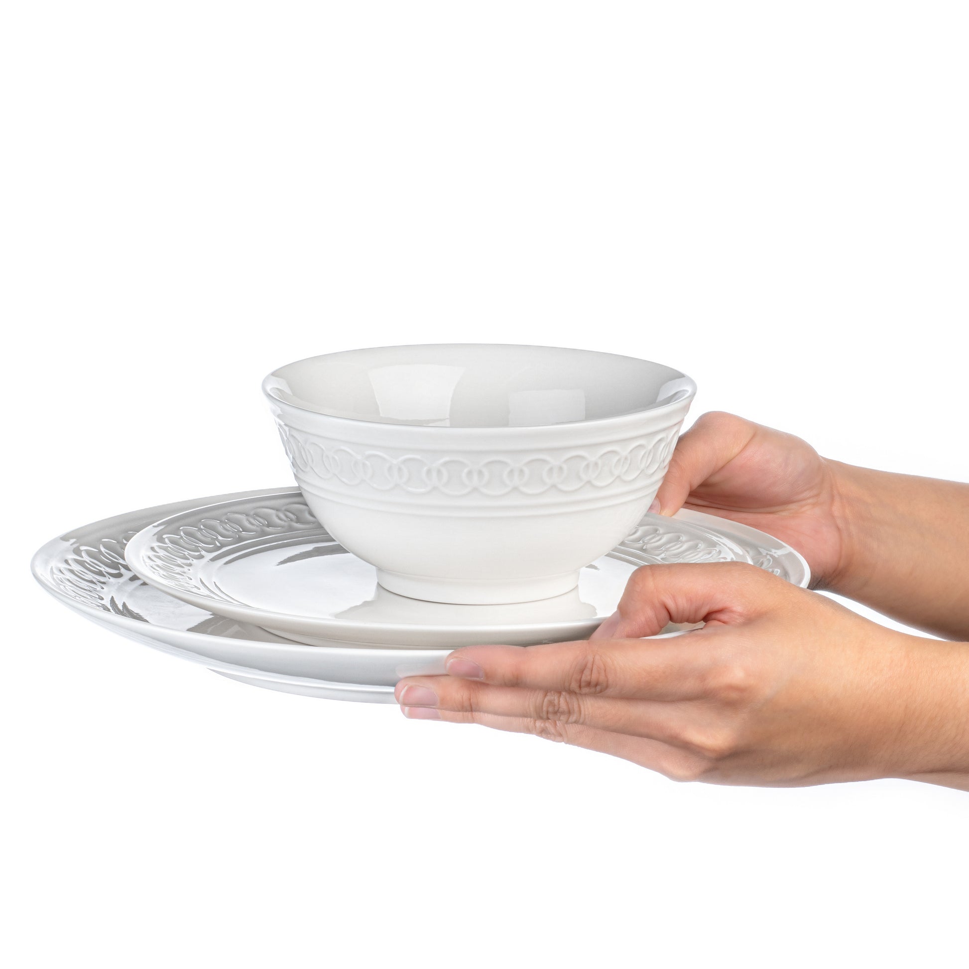- ELEGANT DINING: Experience the elegance of dining with our dish set, a perfect blend of style and functionality. The plates and bowls are bright white, and this Annovero dish set has a custom embossed minimal design on each piece to add a touch of sophistication to your table, ideal for both everyday meals and special occasions.